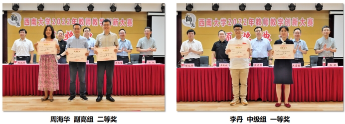 本次大赛由教学创新成果报告、现场教学以及创新成果答辩三部分组成,周海华老师和李丹老师认真撰写了教学创新成果报告,仔细总结了平时的教学实践经验,以生为本,展现了多样化教学形式,专业教学与思政元素有机融合,坚持问题导向,探寻适合学生的综合教学模式。现场教学环节,两位老师用新颖生动的课件,精彩的语言,富有感染力的讲授,把各自的教学风采和教学特点展现得淋漓尽致。在创新成果答辩阶段,评委们对课堂教学方法和典型实践案例等进行了详细提问,两位老师沉着冷静,逐一认真回答评委所提问题,获得了评委的好评。同时,我院也凭借优异的组织工作,荣获本年度西南大学教师教学创新大赛优秀组织奖。