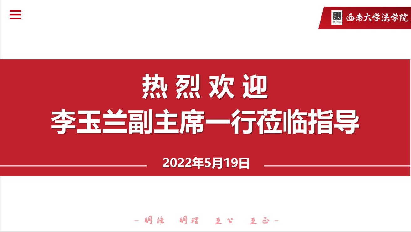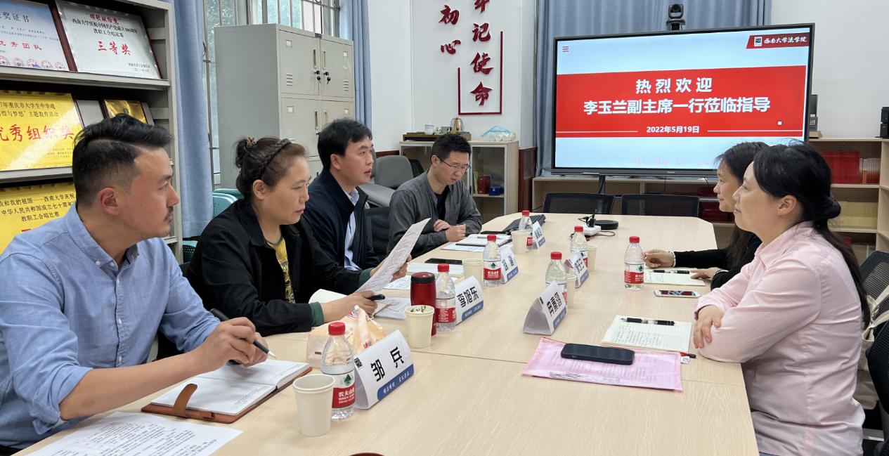 李玉兰副主席充分肯定了法学院工会、教代会近年来所开展的各项工作,对胡建书记的欢迎表达了感谢。同时,李玉兰副主席仔细阐明了本次调研目的,是针对《西南大学党建工作与事业发展融合考核第一类和第三类单位2021年度党建工作部分评分规则》(工会、教代会工作日常了解)进行深度调研。李主席强调,通过调研充分征求二级学院和基层老师的意见,有利于政策的制定和推进实施,有利于教职工急难愁盼问题的解决,有利于助力学校高质量发展,希望学院教职工的重视和支持。