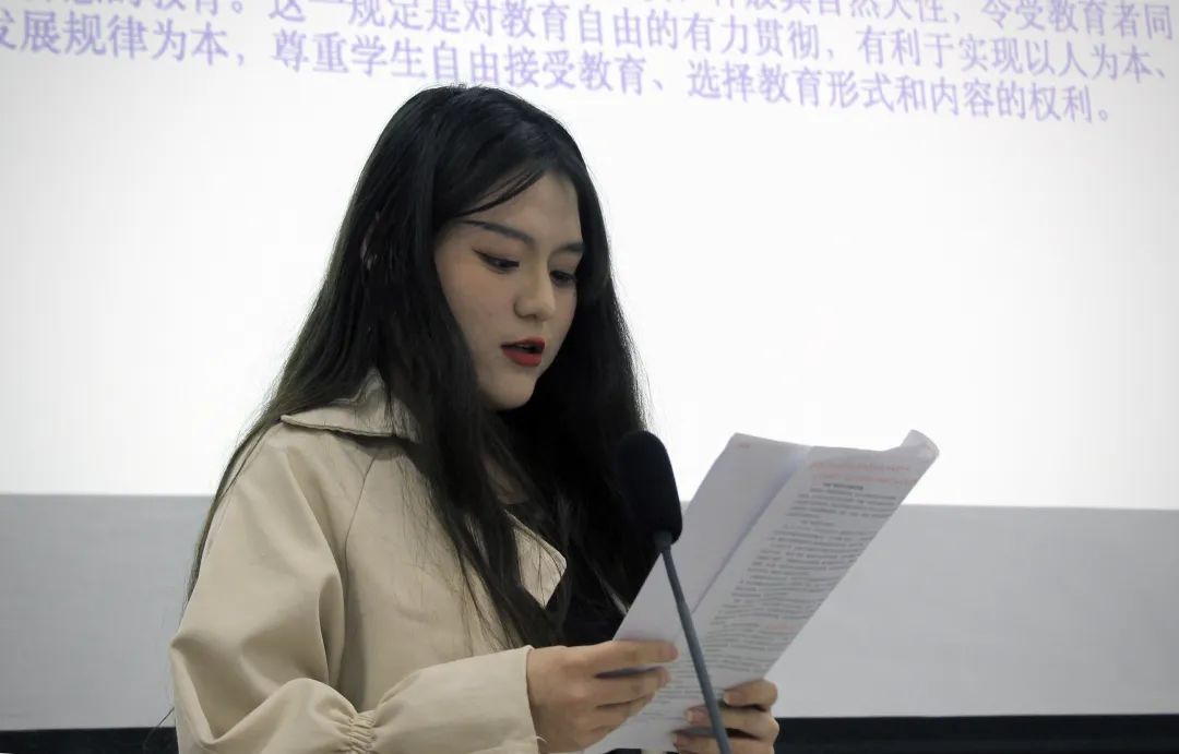 硕士研究生姜雪怡报告了《“双减”政策法律制度研究及完善对策》一文。文章认为, “双减”政策基于随着教育改革推进的背景提出,以《宪法》精神为引导,以《未成年人保护法》、《义务教育法》为直接依据的,体现了法律的公平、自由、秩序等属性,同时也对校外培训机构、教师以及学生的利益分别作出了调整。但这一政策在校外培训规范、教师权益保障等方面,还存在一定的不足。该文采用价值分析法、规范分析法展开研究,对“双减”相关政策进行分析,明确其法律价值、具体内容,并对不足之处提出针对性建议。