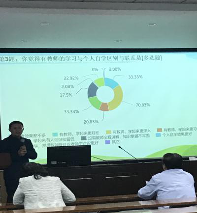 杨攀老师以“经济法”线上线下一体课程为例,与全体老师分享了成功申报2020国家一流课程的理论和实践经验。杨老师介绍了经济法课程的课程目标、建设发展历程、课程与教学改革要解决的重点问题、课程内容与资源建设及应用情况、课程教学内容及组织实施情况、课程成绩评定方式、课程评价及改革成效情况、课程的特色与创新情况,重点介绍了其在课程教学中围绕“知识”与教学而展开的调研、改革情况。在杨老师的模拟课程中,李旭东、杨复卫、陈跃辉、向超、贺奇兵等老师积极参与、互动,气氛活跃。