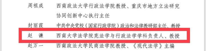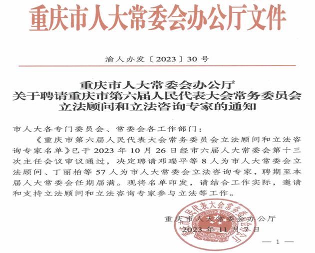 近日,重庆市人大常委会办公厅印发了经市人大常委会主任会议审议通过的重庆市第六届人民代表大会常务委员会立法顾问和立法咨询专家名单。我院邓瑞平教授被聘请为市人大常委会立法顾问,我院赵谦教授被聘请为市人大常委会立法咨询专家。