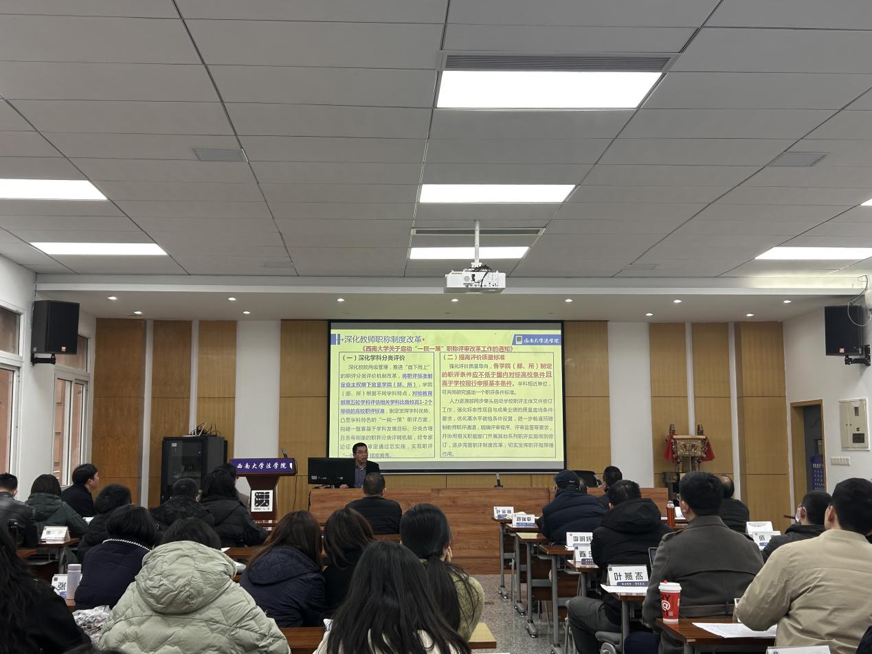 叶金育院长以“学院事业发展与改革报告——2024年度绩效分析”为题做报告。他指出,学院在2024年取得了显著的成绩,各项事业稳步发展,为学院的长远发展奠定了坚实的基础,然而,学院目前也面临着严峻的挑战,如部分教师科研量未完成、项目申报情况不佳等。他强调,这些问题需要引起全院教师们的高度重视,并采取有效措施加以解决。为了应对这些挑战,他提出了“融入学校,加速改革,守住拐点,主动未来”的策略,鼓励老师们要深刻把握抓住学校深化改革契机,学院将在职称评审、科研工作、年度考核等领域推进改革,提高教育教学质量,为培养更多优秀人才做出更大的贡献。