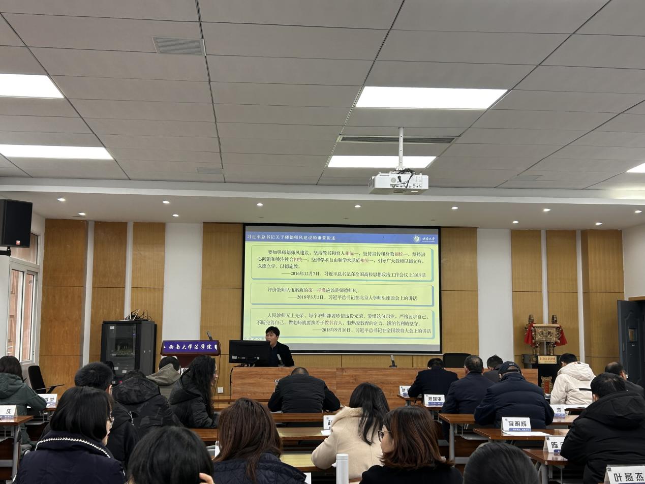 胡建书记领学习近平总书记对新时代马克思主义理论研究和建设工程作出的重要指示精神等内容,着重领学习近平总书记关于师德师风建设的重要指示批示精神,通过具体案例强调了教师在教育教学活动中应当严格遵守《新时代高校教师职业行为十项准则》。他指出,学院正处于改革的关键时期,每位教师都应主动适应改革的方向,积极投身于学院的发展。同时,也指出学院将进一步加强对教师的管理,确保教师能够全身心地投入到教学和科研工作中。