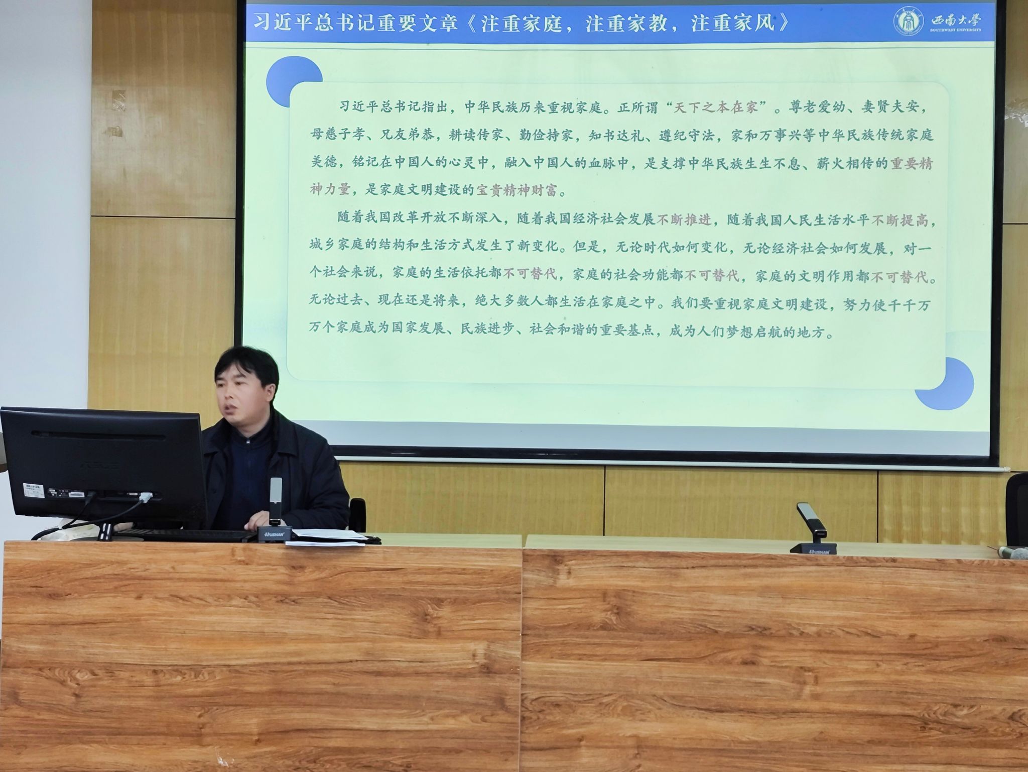 胡建书记通报了学院假期工作情况以及学院内设机构调整、人员分工情况,带领学习习近平总书记在民营企业座谈会上的重要讲话精神、《求是》杂志发表的习近平总书记重要文章《注重家庭,注重家教,注重家风》,重点传达2025年春季学期干部大会精神,并结合学院工作实际号召老师们以主人翁的姿态融入学校和学院的建设发展,积极践行教育家精神。