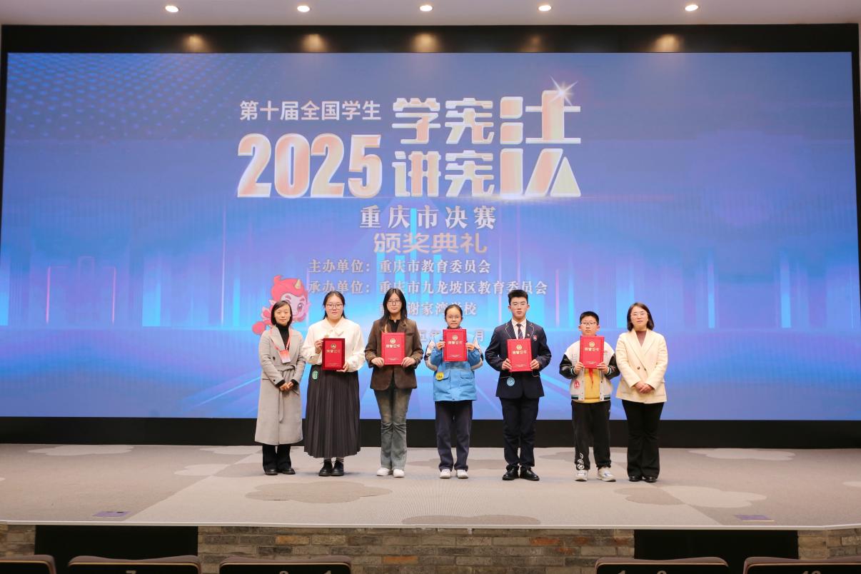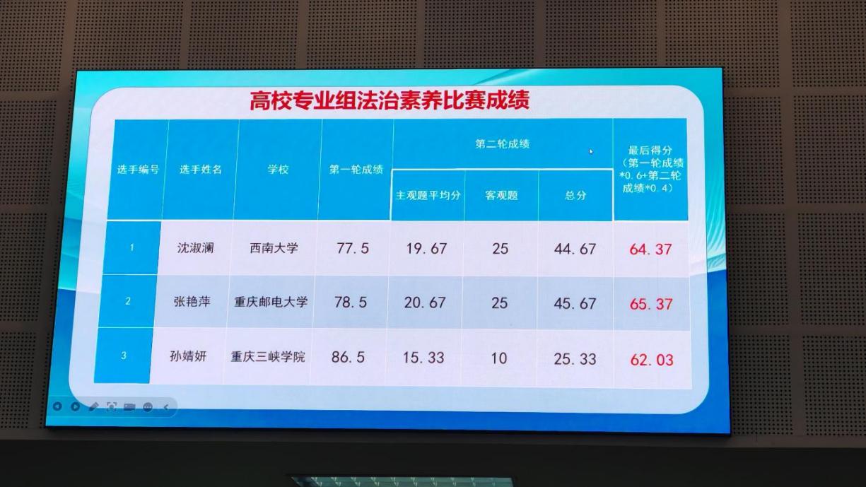 11月23日,第十届“学宪法讲宪法”法治素养竞赛圆满落下帷幕。此次竞赛由重庆市教育委员会主办,九龙坡区教育委员会和重庆市谢家湾学校联合承办,分为演讲比赛、法治素养大赛和法治情景剧大赛。该活动今年8月启动,经层层选拔,共有名115中小学生和67名高校学生入围法治素养竞赛决赛。学院本科生2024级沈淑澜同学获得法治素养竞赛高校组(专业类)亚军。