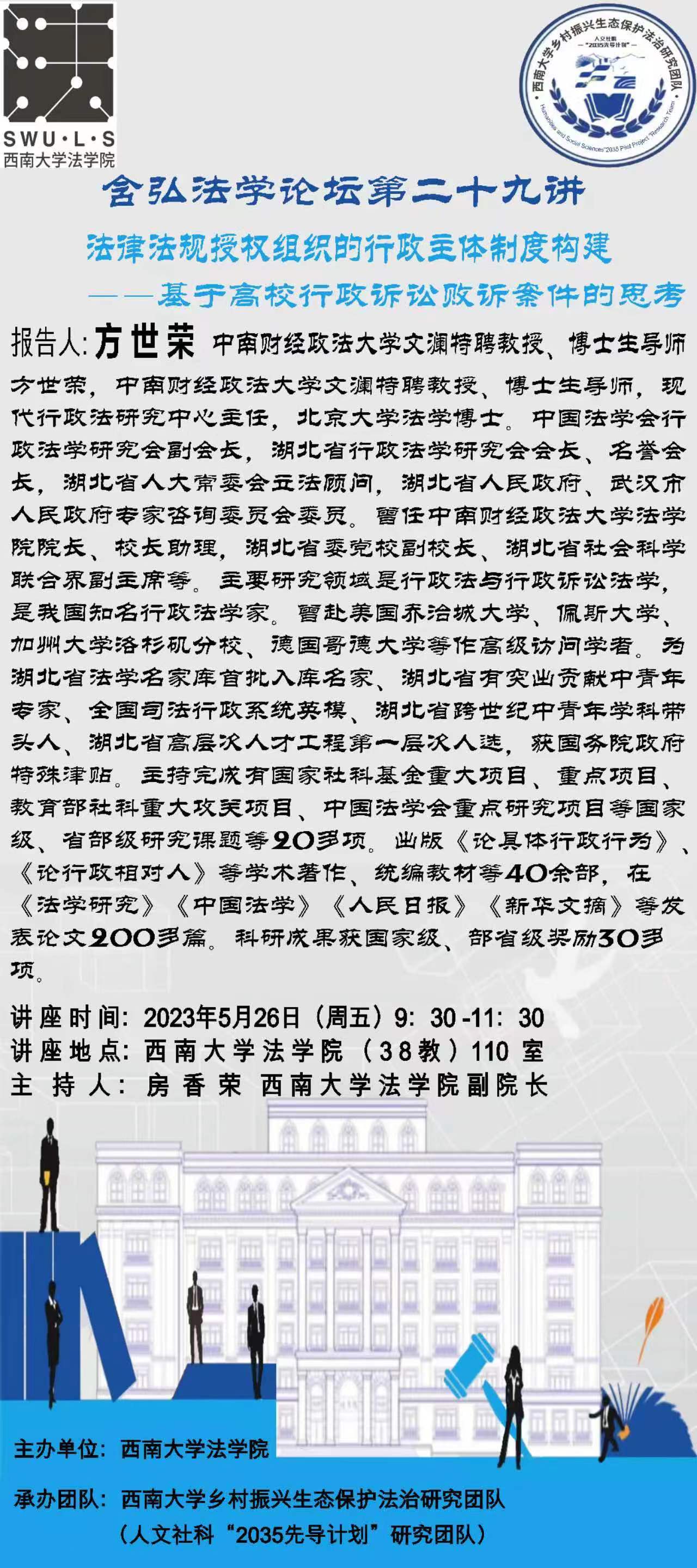 承办团队:西南大学乡村振兴生态保护法治研究团队(人文社科“2035先导计划”研究团队)