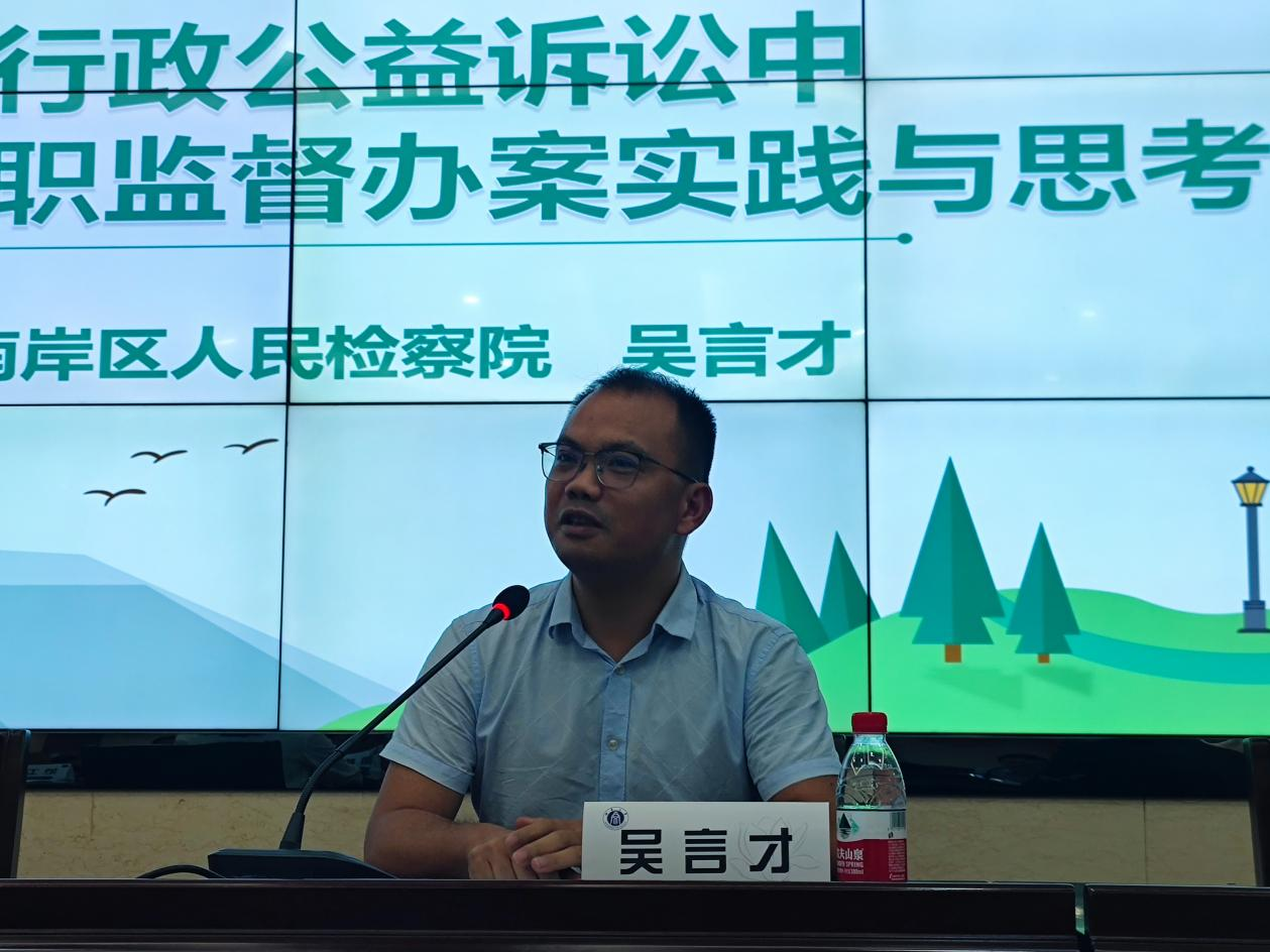 重庆市南岸区人民检察院副检察长吴言才围绕“环境行政公益诉讼中乡镇政府履职监督办案实践与思考”进行主题发言。吴言才副检察长首先以法律和司法解释为依据,阐释了环境公益诉讼中对乡镇政府的可诉性问题,提出要以可诉性促进提升公益诉讼检察办案的精准性和规范性。其次,在起诉的必要性方面,他提出在行业主管部门和乡镇政府都未完全履职、有效修复受损公益的情况下,更要注重综合审查起诉乡镇政府的必要性。最后,他提出检察机关应充分审查乡镇政府依法履行职责的情况,综合研判公益受损程度,做到当诉则诉,以实现生态环境最严密的法治保护。
