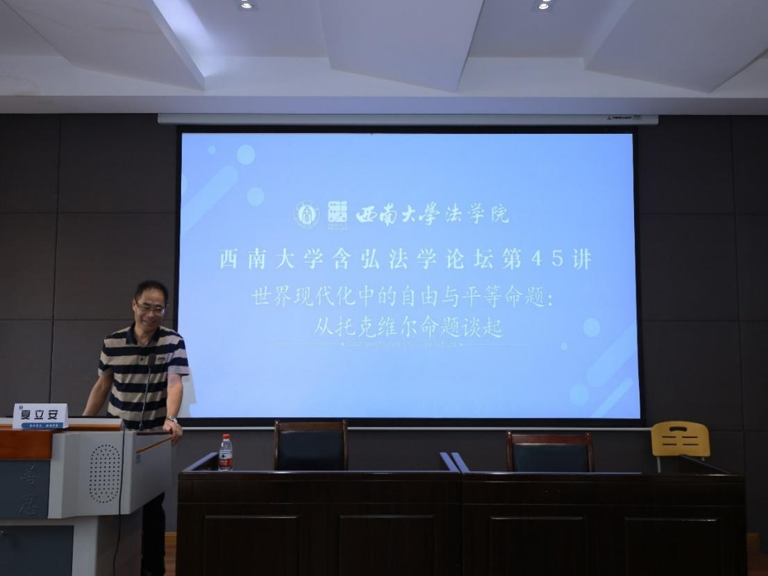 9月24日,学院举办含弘法学论坛第45讲。浙江大学365上市公司(英国)集团教授、博士生导师夏立安教授以“世界现代化中的自由与平等命题——从托克维尔命题谈起”为题作了主题讲座。活动由学院李明辉副教授主持,重庆大学365上市公司(英国)集团陈锐教授,学院时显群教授、陈全真老师、王文玉老师及百余名研究生、本科生参加了本次讲座。