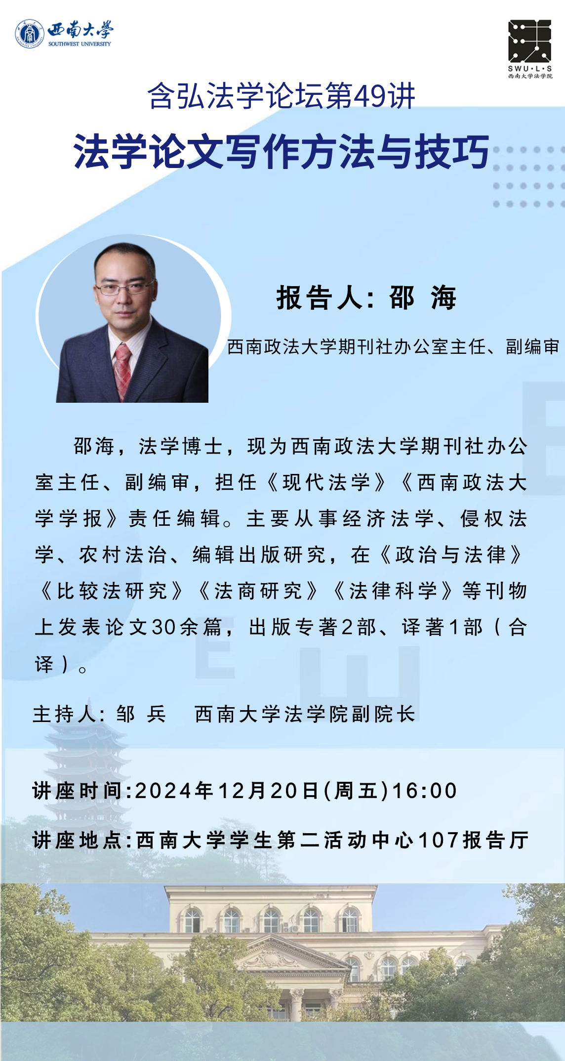 【含弘法学论坛第49讲】(12月20日)邵海:《法学论文写作方法与技巧》