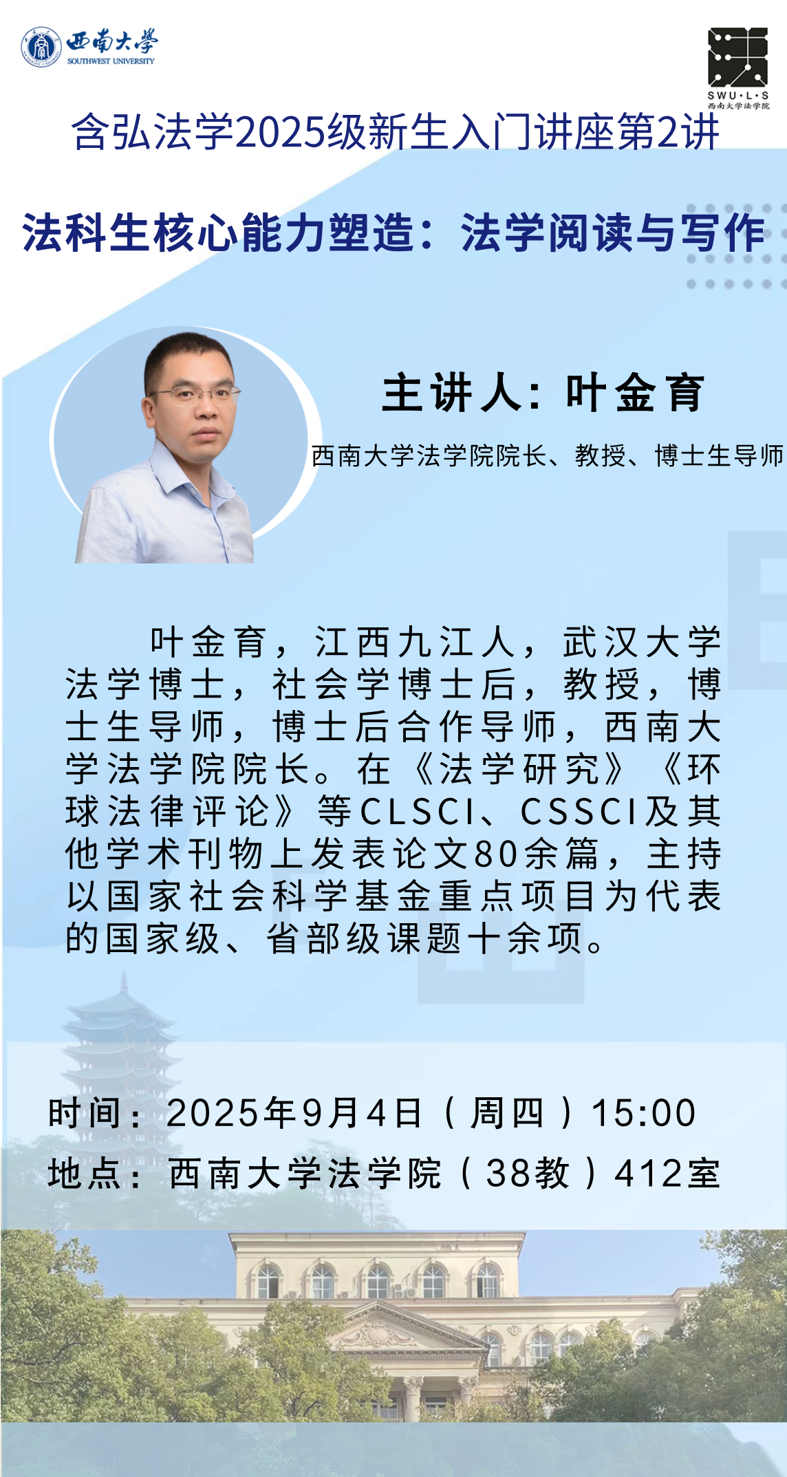 【含弘法学2025级新生入门讲座第2讲】(9月4日)叶金育:《法科生核心能力塑造:法学阅读与写作》