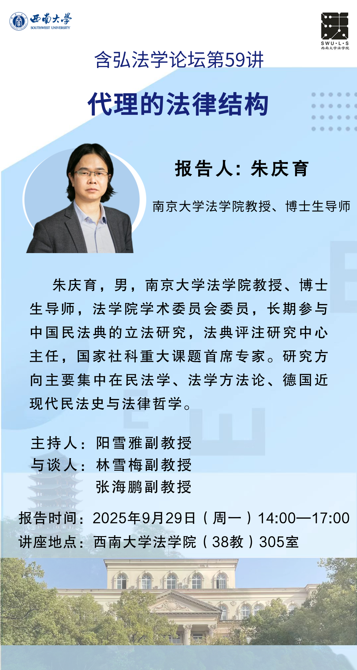 【含弘法学论坛第59讲】朱庆育:《代理的法律结构》