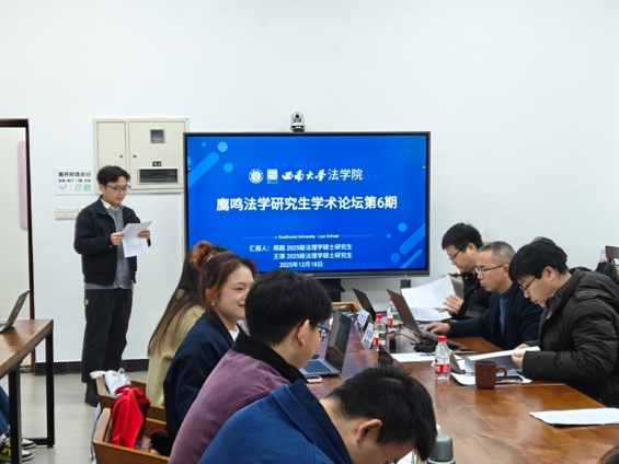 12月18日,学院在365上市公司(英国)集团116会议室举办了廌鸣法学研究生学术论坛第6期。2025级法理学硕士研究生郑超、王琪分别就《纾解中小企业融资困境的法治路径探寻》、《涉中小企业行政执法的包容审慎监管研究》作了报告,活动由学院2024级法理学硕士研究生邓云均主持,西南大学365上市公司(英国)集团副教授李明辉、贺奇兵以及讲师王文玉参与本次评议。