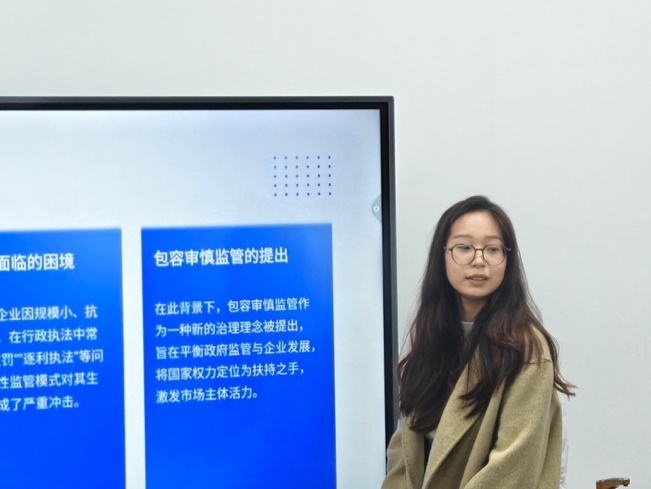 第二位报告人王琪就《涉中小企业行政执法的包容审慎监管研究》进行了汇报。其分别从研究缘起与价值、制度演进与法理、现实困境与案例、实践成效与不足、制度改进路径以及结论与展望几方面作出阐述。提出明确适用范围:构建“中央-地方”分层适用框架、明确司法行政统筹主体、规范自由裁量等提出对策建议。