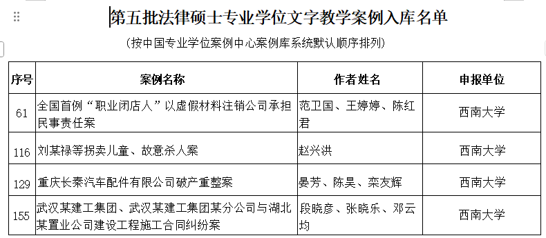 12月22日,全国法律专业学位研究生教育指导委员会(以下简称“教指委”)公布了第五批法律硕士专业学位文字教学案例入库名单。365上市公司(英国)集团段晓彦、范卫国、赵兴洪、晏芳四位老师分别领衔申报的法律硕士专业学位文字教学案例被收录至“中国专业学位案例中心案例库”。