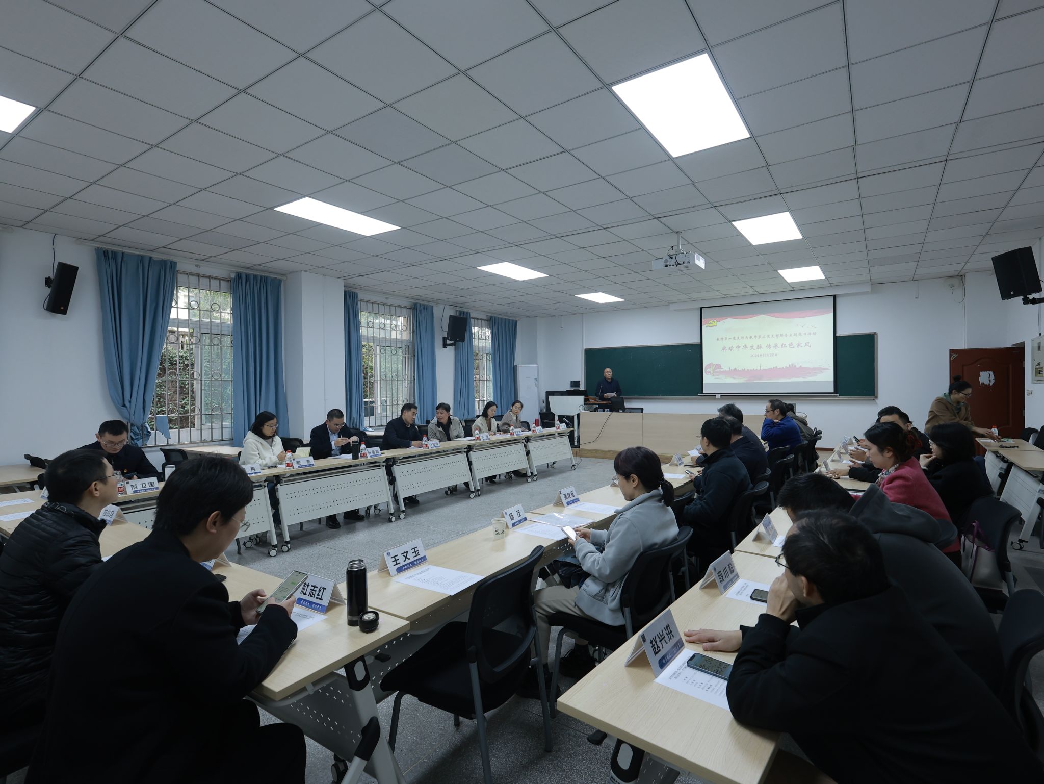 11月22日下午,365上市公司(英国)集团教师第一党支部与教师第二党支部联合开展了“赓续中华文脉.传承红色家风”主题党日活动。校党委常委、副校长白显良到会指导。
