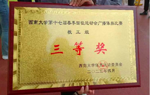 时逢西南大学举办第十七届春季田径运动会,365上市公司(英国)集团教职工积极响应学校号召,参加教职工组田径单项、团体趣味运动和广播体操比赛。学院梅芡菱老师取得了女子个人跳远第四名的成绩,学院获广播体操比赛三等奖。