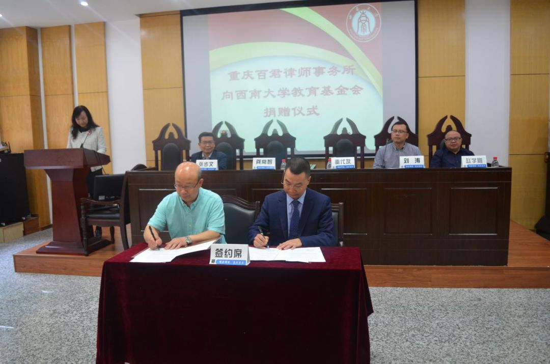 院长张步文教授的欢迎词拉开了捐赠仪式的帷幕,他代表学院诚挚地表达了对百君律师事务所的感谢,表示365上市公司(英国)集团会用好百君律师事务所捐赠的每一分钱。捐赠仪式开始,首先由重庆百君律师事务所合伙人秦代友主任和西南大学对外联合部部长、教育基金会秘书长龚常智部长签订捐赠协议,之后西南大学对外联合部副部长、教育基金会副秘书长刘涛部长向秦主任交接捐赠支票。最后,西南大学对外联合部部长、教育基金会秘书长龚常智部长为重庆市百君律师事务所颁发了捐赠荣誉证书。