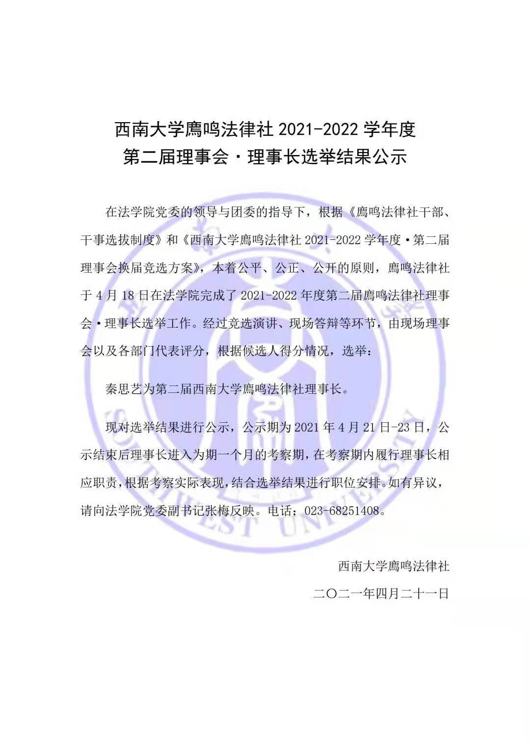 西南大学廌鸣法律社2021-2022学年度 第二届理事会·理事长选举结果公示
