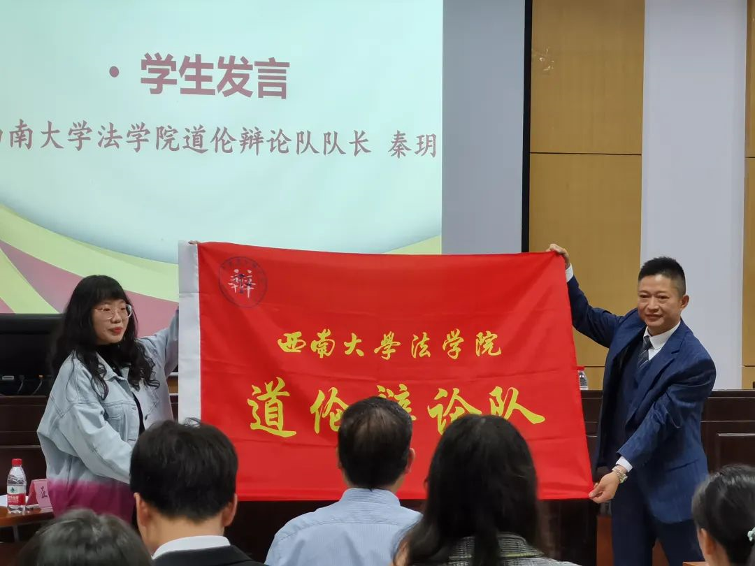 在随后的礼品捐赠环节,重庆道伦律师事务所管委会主任李德伦律师、副主任廖磊律师分别接受了道伦辩论队队员赠送的队旗和队服。