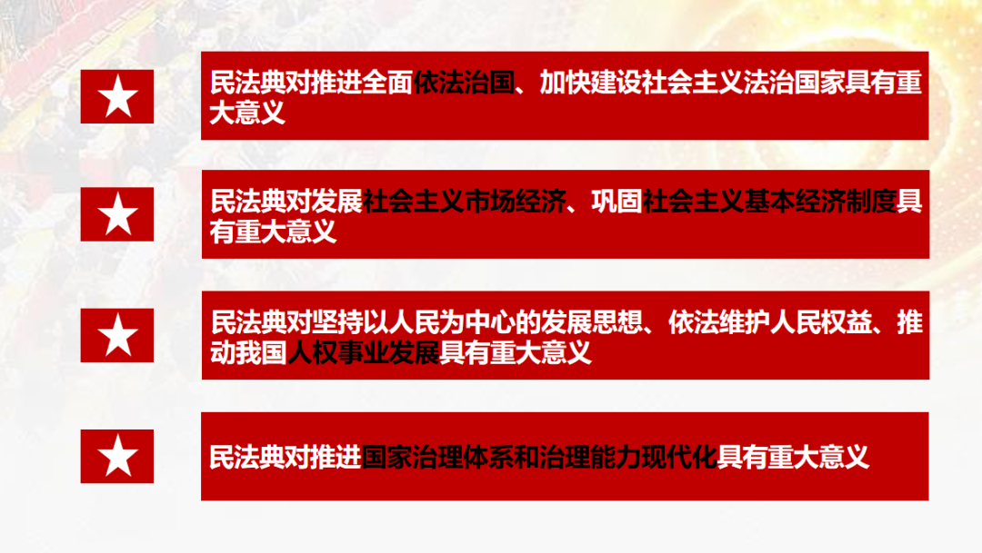 《中华人民共和国民法典》标志着中国民法体系从“法律”到“法典”的历史转换,是推进全面依法治国、推进国家治理体系和治理能力现代化的一个重大举措,是坚持和完善社会主义基本经济制度、推动经济高质量发展的客观要求,是增进人民福祉、维护最广大人民民事权利的一个必然要求,具有重大的现实意义和深远的历史意义。