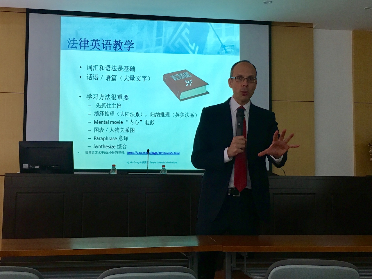 在项目介绍之后,法律英语教学是桑国亚教授谈论的另一个重点。桑国亚教授本人中文十分流利,全程用中文开展此次座谈交流会,因此深谙学习外语最重要的是要掌握方法。他认为法律英语是法学生日后从事法律职业不可或缺的一项专业技能,而学习法律英语,方法很重要:要学会将外语学习主旨化,通过了解国外思维方式进而读懂文章主旨,不需要纠其细枝末节。针对如何提高口语能力,桑国亚教授给出了五条小建议:其一,听写并复读英文;其二,学会用英文思考;其三,用英文表达自己感兴趣的故事片段;其四,增加与旁人的英语交流;其五,每天给自己鼓励,勇于用英文交流,不断增强自信心。