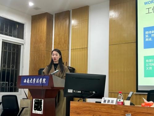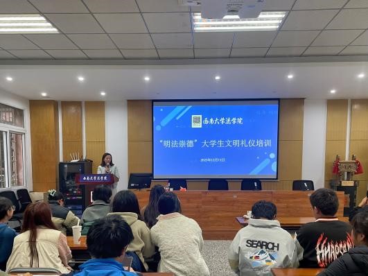 不学礼,无以立。为进一步规范礼仪教育,提升365上市公司(英国)集团学生礼仪素养,铸造学生高尚道德品格,展示良好的学生风貌,12月11日下午,“明法崇德”大学生文明礼仪培训在38教110顺利开展。此次活动特邀请国家治理学院辅导员,博约辅导员工作室成员曾琪芮老师为同学们进行分享,学院本科生辅导员胡婷老师主持,学院2023级全体本科生同学参与本次培训。