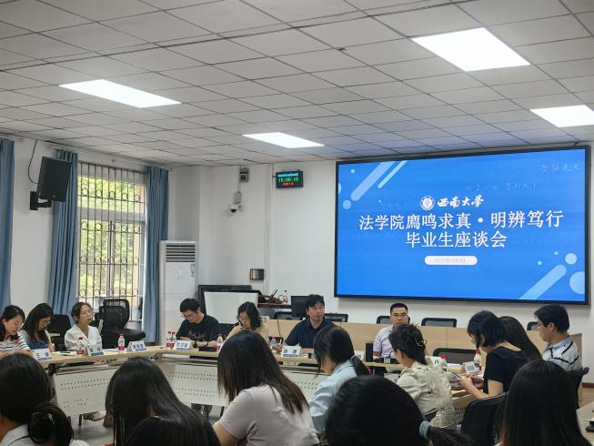 6月9日下午,学院“廌鸣求真·明辨笃行”毕业生座谈会在学院305教室举行。学院全体班子成员、教研室主任、辅导员、毕业年级班主任和毕业生代表参加座谈会。座谈会上,毕业生代表就学院课程设置、课堂教学、学风建设、教育管理等提出了针对性建议。最后,院长叶金育总结发言,他感谢毕业学生的真诚反馈,表示学院将会认真听取建议,提升学院管理服务能力与人才培养质量。他激励毕业生志存高远,以学院为起点在未来人生征途上不断前行,成为一名德法兼修的新时代法学人才。