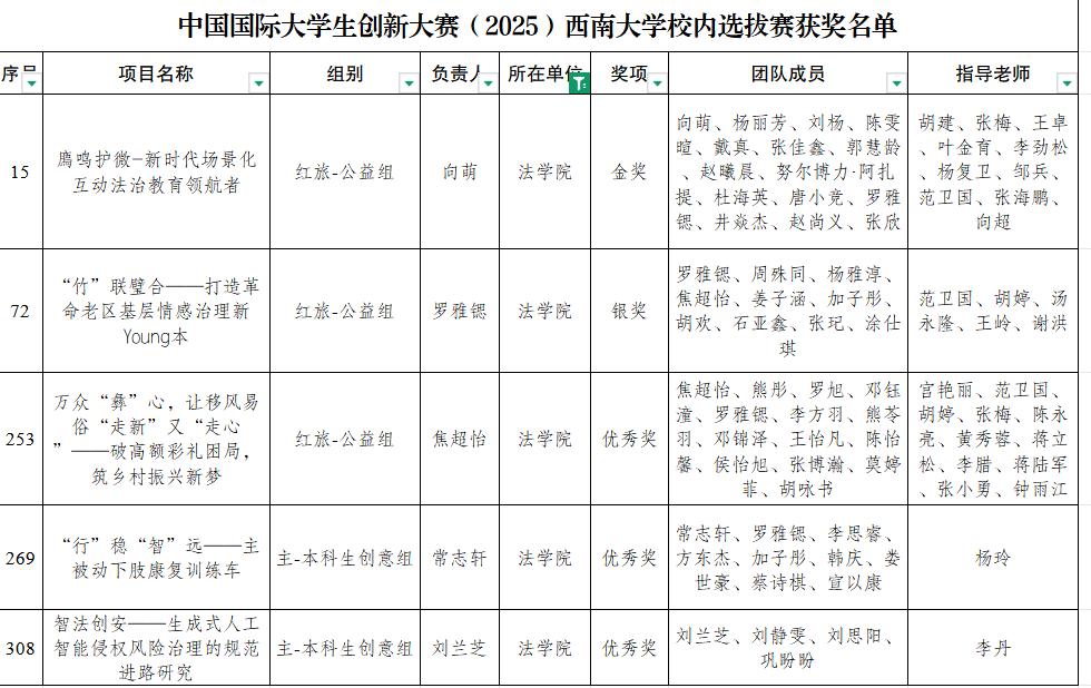 近日,中国国际大学生创新大赛(2025)西南大学校内选拔赛获奖名单正式公布,学院研究生向萌领衔的《廌鸣护微-新时代场景化互动法治教育领航者》、本科生罗雅锶领衔的《“竹”联璧合——打造革命老区基层情感治理新Young本》等5项成果从众多参赛作品中脱颖而出,最终斩获赛事金奖1项、银奖1项、优秀奖3项。