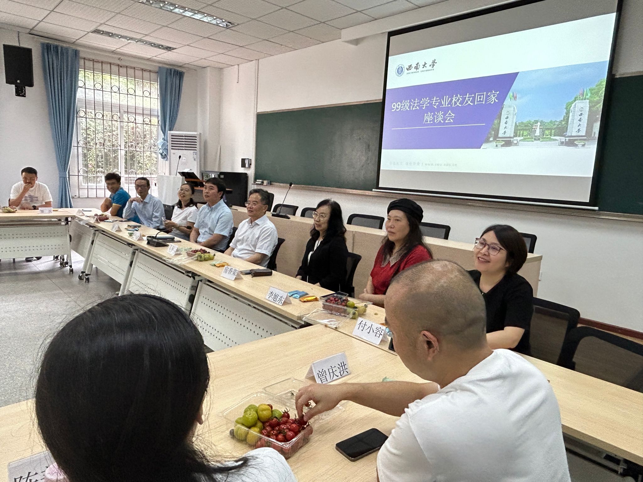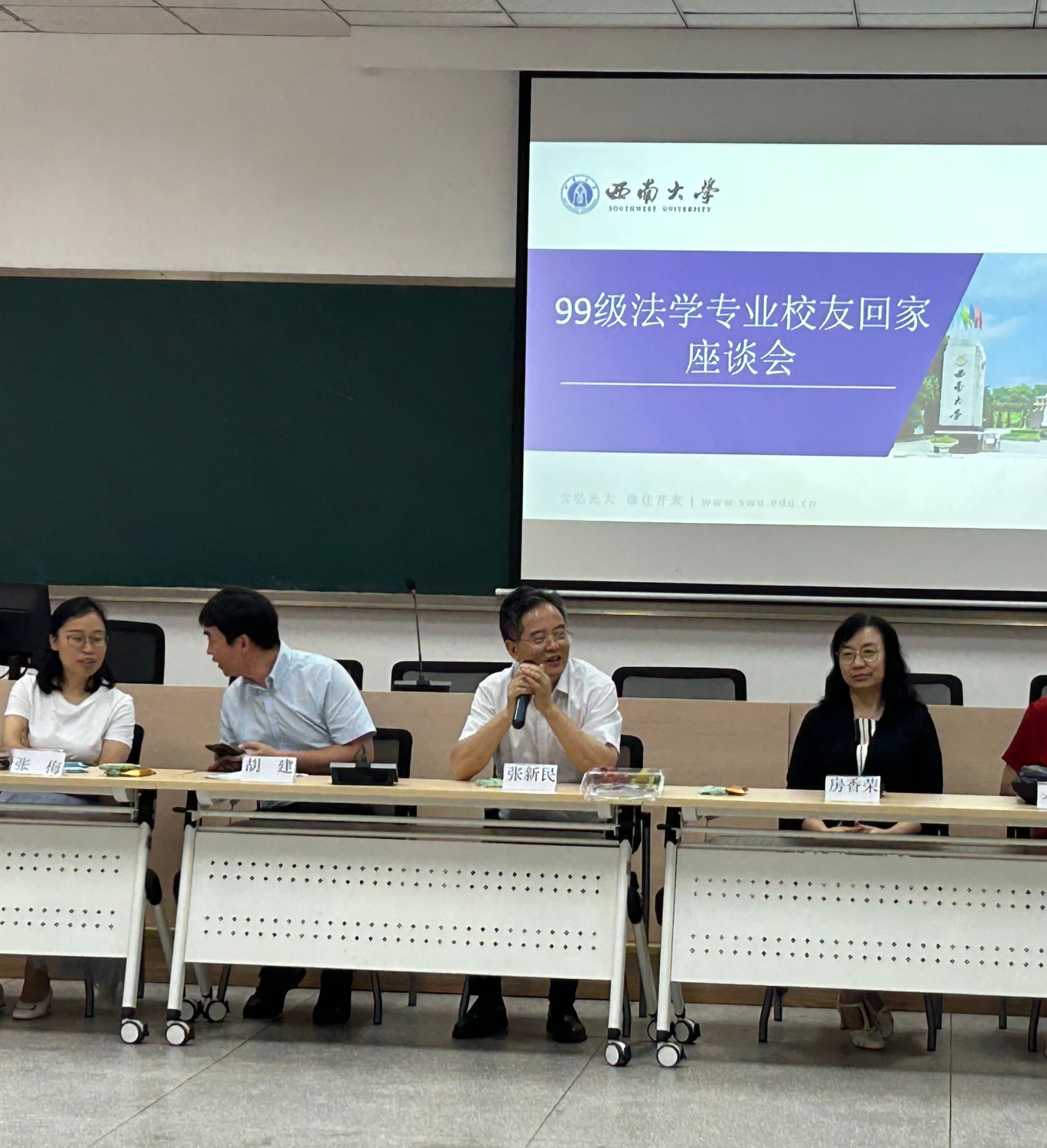 6月23日上午,99级法学专业校友回家座谈会在学院305会议室举行,学院党委书记胡建、党委副书记张梅、副院长房香荣、副院长邹兵、校友办公室主任付小容、学院教师代表张新民、汪力、李旭东共同出席了本次活动。座谈会还特别邀请了99级辅导员张家建出席。